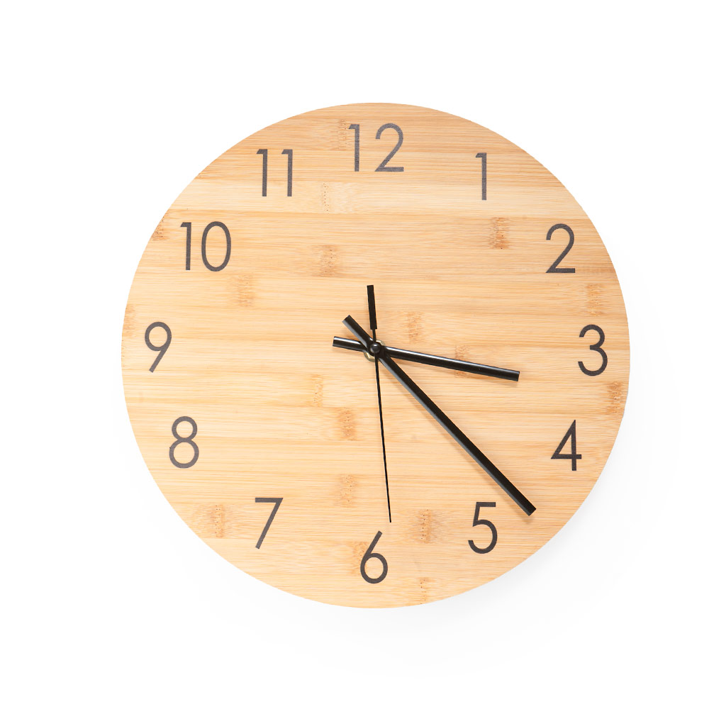 Reloj de pared en bambú con manecillas en aluminio. Números de gran tamaño para mejor visibilidad. No incluye baterías.